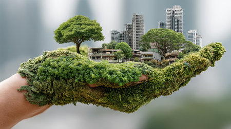 Hand holding a miniature cityscape with trees, promoting sustainable and eco-friendly living