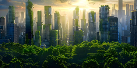 A futuristic cityscape blends with lush greenery, symbolizing sustainable urban living. AIG41