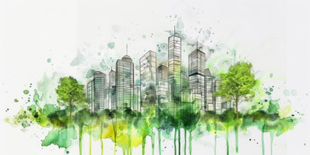 Generative AI, Watercolor painted green ecology urban landscape, Sustainable Living, Eco-Friendly concept
