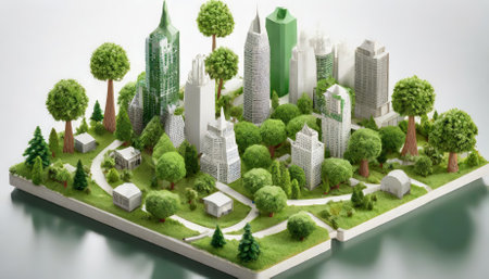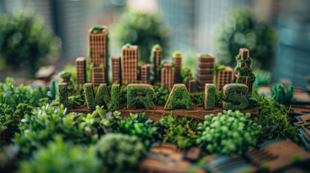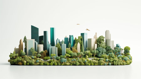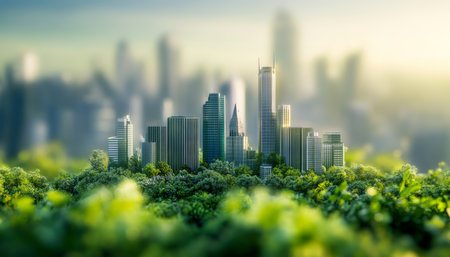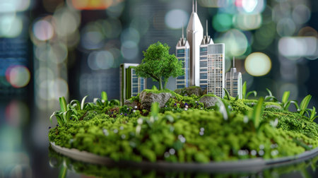 Miniature cityscape featuring skyscrapers and greenery, symbolizing urban sustainability and nature