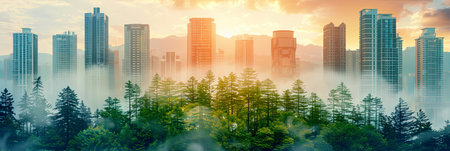 Wide banner of cityscape skyline double exposure with nature green forest vegetation