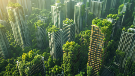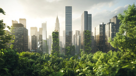 Skyscrapers rise in a modern city while greenery envelops buildings under morning sunlight.