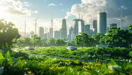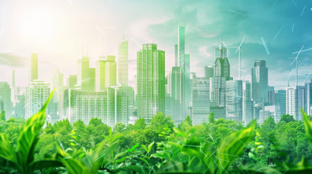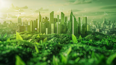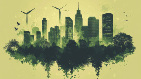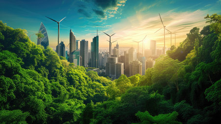 Urban skyline with wind turbines and greenery showcasing sustainable development concept