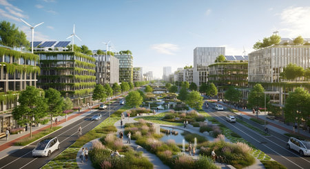 A vibrant, futuristic city showcases sustainable architecture, abundant green spaces, and clean energy solutions under a bright sky.
