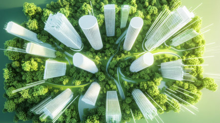 A stunning urban landscape showcasing modern architecture harmonized with lush greenery. This image illustrates sustainability in architecture and city life.