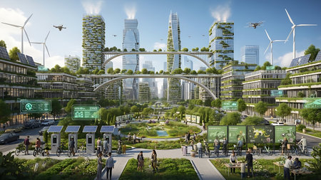 A vibrant, eco-friendly smart city showcasing renewable energy, green architecture, drones, and sustainable urban life with lush parks and modern infrastructure.