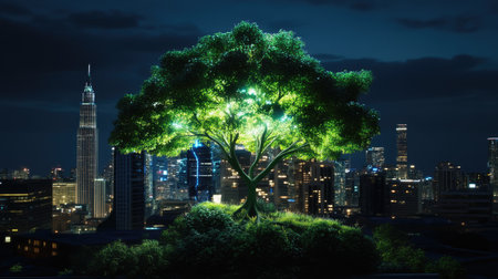 Stunning sunset illuminates city skyline, featuring three large trees with glowing elements, symbolizing nature integration with urban life. scene evokes sense of harmony and innovation