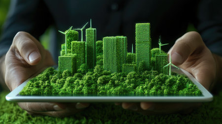 A pair of hands holds a tablet showcasing a miniature green city filled with skyscrapers, wind turbines, and rich vegetation, symbolizing sustainability and innovation.