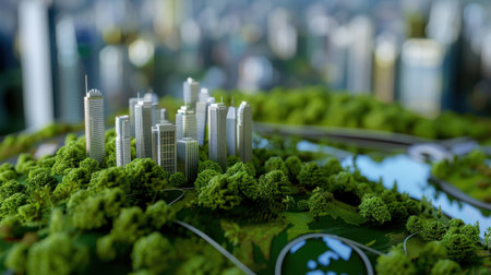 This captivating image depicts an intricate model of a modern city, highlighting skyscrapers surrounded by lush greenery. The vibrant colors and detailed architecture create a striking visual representation of urban development, showcasing the harmony between nature and contemporary design.
