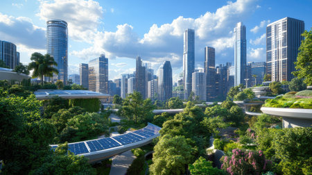 A Modern Urban Landscape with Lush Greenery, Skyscrapers, and Sustainable Living Features