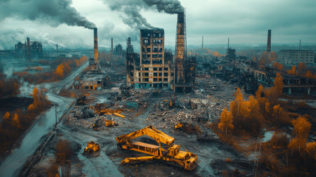 An aerial view of a desolate industrial area shows a crumbling factory surrounded by debris and machinery. Smoke rises from chimneys against a cloudy sky.