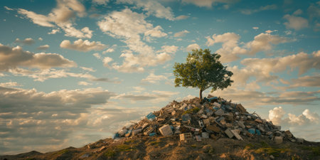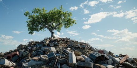A tree is growing on top of a pile of trash. Concept of hope and resilience in the face of environmental challenges