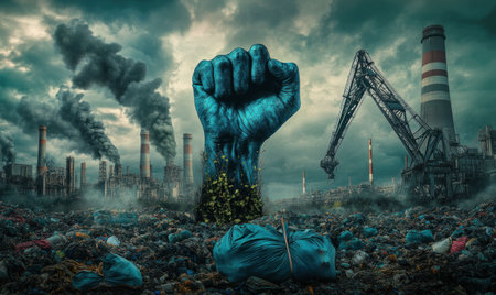 environmental activism, pollution, industrial landscape, protest, garbage heap, power fist, ecological crisis, global warming, awareness, deforestation, climate change, power of the people, fight for