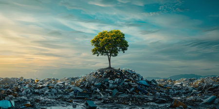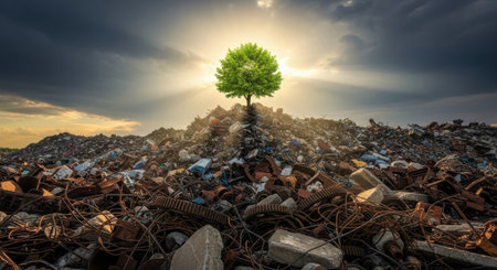 A vibrant green tree emerges from a massive pile of refuse, symbolizing hope and resilience against environmental degradation.