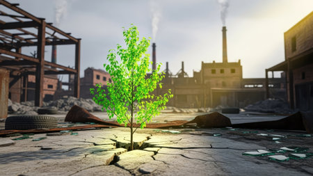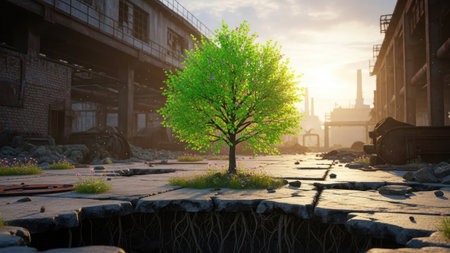 A vibrant green tree springs from broken concrete against a backdrop of dilapidated industrial buildings. The image uses dramatic lighting and a realistic style to highlight the tree's resilience. The scene suggests a post-apocalyptic or environmental concept suitable for illustrating ecological themes and concepts of rebirth or hope.