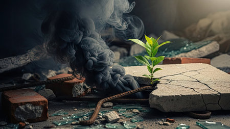 A vibrant green plant emerges from fractured concrete and debris, amidst swirling dark smoke. The composition features broken bricks and scattered glass, with warm lighting creating contrast. It could be used in editorial or commercial content related to environmental themes and concepts of hope.