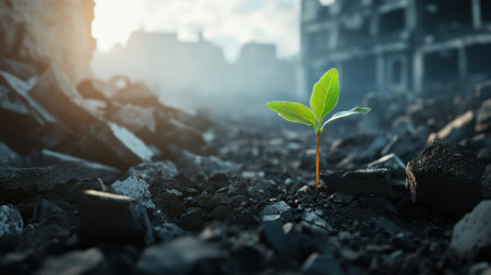 A vibrant green plant emerges from cracked soil amidst rubble, symbolizing hope and resilience in an abandoned urban landscape, showcasing nature's determination to thrive.