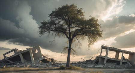 AI Generated. Desolation and Resilience A Lone Tree Stands Amidst the Ruins of a Destroyed Building Under a Dramatic Sky