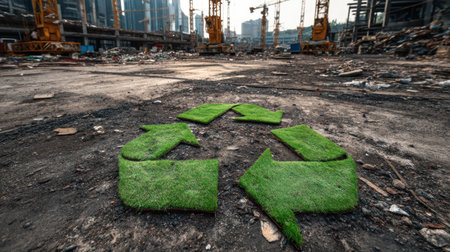A vibrant green recycling symbol made of grass sits prominently on a construction site, showcasing the juxtaposition of nature and urban development.