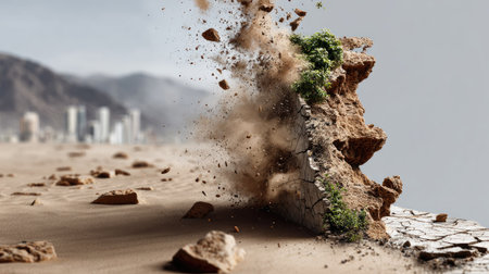 A captivating visual of erosion showcasing dust and cracked earth intermingled with vibrant greenery, set against an urban skyline. The image captures the contrast between nature and city life, illustrating themes of resilience, growth, and environmental change.