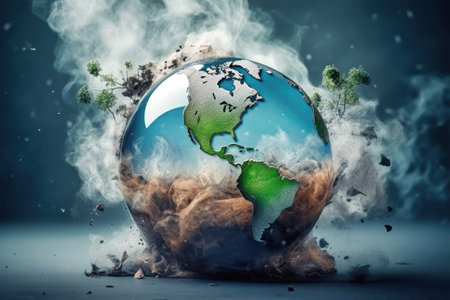A globe engulfed in smoke and surrounded by ash, a stark reminder of the environmental catastrophe impacting our planet.