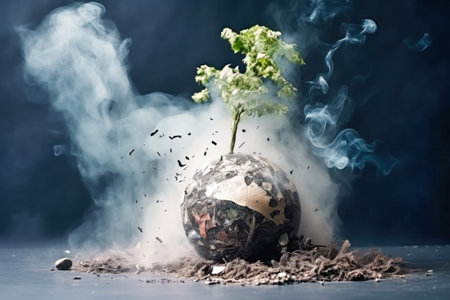 A small tree sprouts from a cracked Earth globe, engulfed in smoke and debris, symbolizing the resilience of nature amidst environmental devastation.