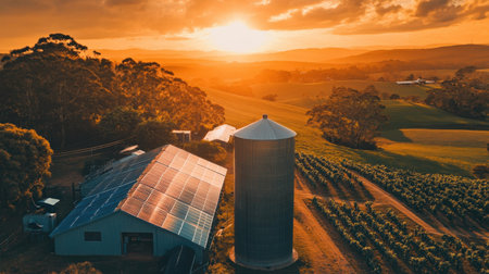 A breathtaking view of a vineyard at sunset, highlighting solar panels on a barn and a silo, set against lush green hills and a warm orange sky.