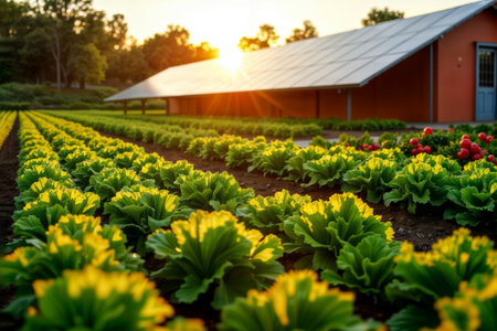 Solar panels in agriculture. Rows of fresh lettuce and radishes growing near a solar panel-covered shed, illustrating the synergy between farming and renewable energy.
