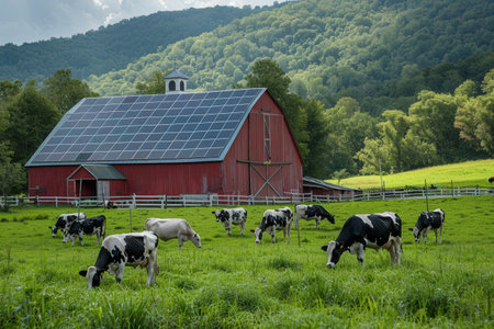 A red barn with solar panels on its roof is situated in a green pasture where a herd of black and white cows graze, with lush, forested hills in the background