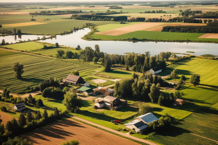 Generative AI, Farm landscape, agricultural fields, beautiful countryside, country road. Nature Illustration, photorealistic top view drone, horizontal banner.