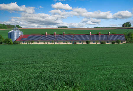 Green energy with solar collectors on the roof of an agricultural building