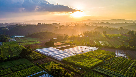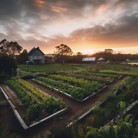 A vibrant farm scene at sunset, showcasing rows of fresh vegetables and greenhouses under a golden sky.