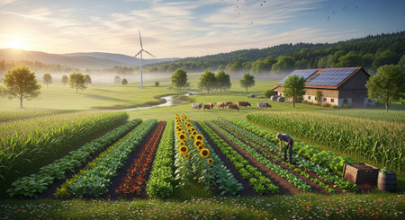 A picturesque rural farm scene unfolds at sunrise, bathed in warm golden light. Rows of vibrant crops, including sunflowers and corn, stretch across the foreground, with a farmer tending to the garden. In the middle ground, cattle graze peacefully in a lush pasture, while a rustic barn with solar panels and a distant wind turbine signify sustainable energy. Rolling hills and a treeline form the backdrop under a soft, hazy sky, creating a serene and idyllic agricultural landscape.