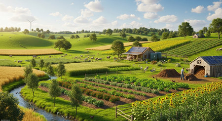 A picturesque rural landscape unfolds with rolling green hills dotted with trees and a winding stream. A working farm is central, featuring a barn with solar panels, a farmhouse, and various agricultural activities. Fields of wheat, sunflowers, and vegetable gardens are meticulously arranged, with sheep, cows, and chickens grazing peacefully. Windmills and wind turbines are visible in the distance, suggesting sustainable energy. The sky is a bright blue with fluffy white clouds, casting a...