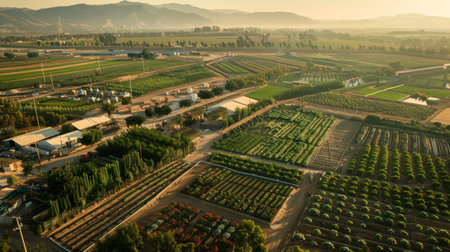 An extensive farm with silos, barns, and rows of vegetables and grains Generative AI