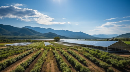 Sustainable agriculture landscape. Green fields and renewable energy. Farming and clean power.