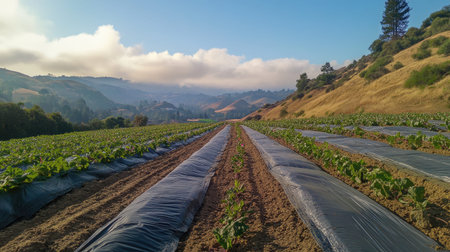 A beautiful view of a cultivated field showing rows of green plants covered with black plastic mulch, set against rolling hills under a clear blue sky.