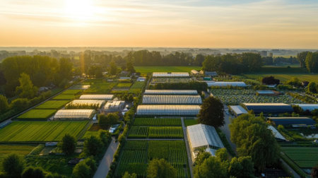 Aerial view of a large greenhouse complex with glass roofs reflecting sunlight, surrounded by lush green fields.