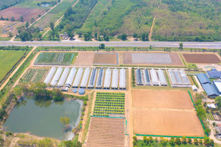 Aerial top view of roof of garden plant industry farm in agriculture concept with paddy rice field. Hydroponic natural food. Crops. Nature landscape background.