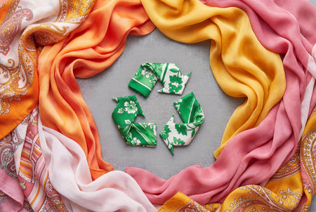 A colorful flowing silk scarves, artfully folded to form a recycling symbol in the center. The vibrant fabrics create a visually striking representation of textile recycling and sustainable fashion.