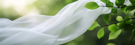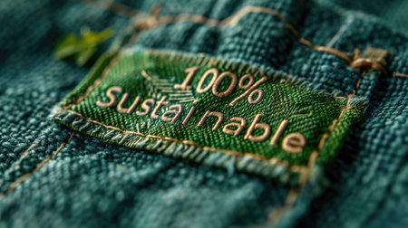 Macro shot of a bamboo fabric clothing label, highlighting the text 100 Sustainable , natural green background .