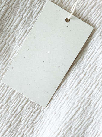 Blank fashion brand label tag, sale price card on luxury fabric background, shopping and retail concept