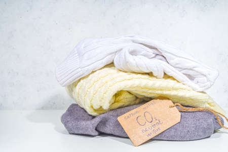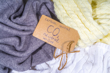 Carbon neutral, CO2-free concept product. Natural organic cotton clothing, with CO2 neutral tag verified, on the desk at home or in a store