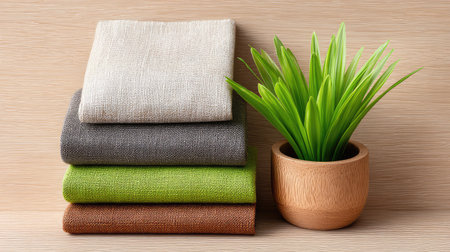A visually appealing arrangement of soft, textured fabrics stacked beside a vibrant green plant in a ceramic pot, perfect for enhancing home aesthetics and interior design.