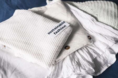 ethical brands and fair trade concept, pile of clothing with Sustainable Fashion label