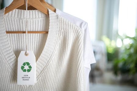 An eco-friendly sweater with a recycling symbol is displayed beside a green houseplant.