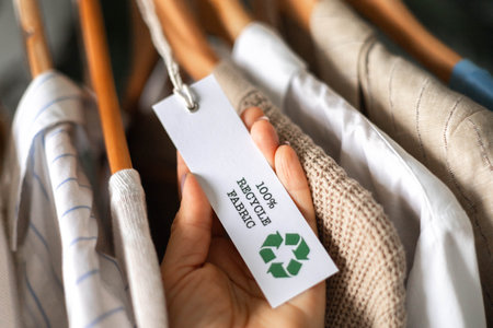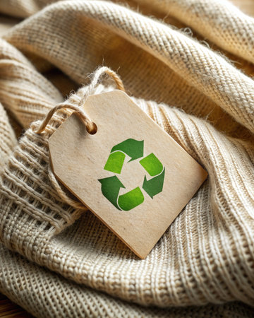 Recycled Paper Tag with Green Recycling Symbol on Fabric