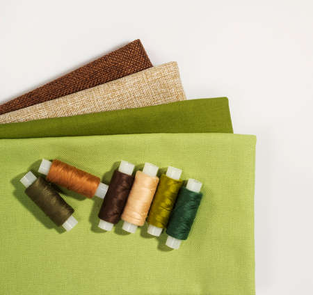 Concept of a sewing workshop or fabric store. Stack of brown and green fabrics on white background