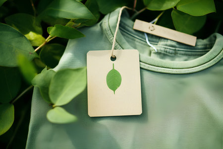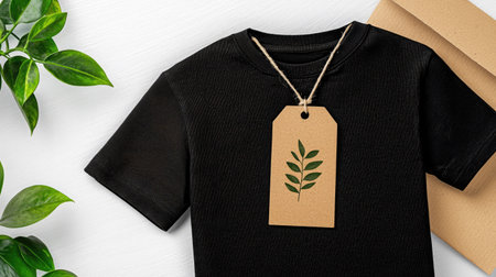 A black t-shirt lays flat with a natural tag featuring a green leaf, accented by greenery and a soft background, highlighting eco-friendly fashion design.