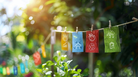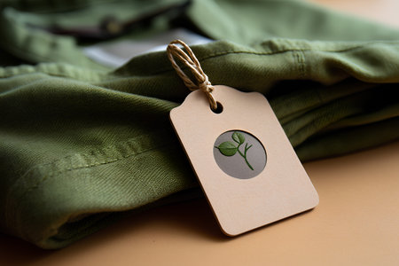 Vibrant colorful tabs and labels showcasing eco-friendly materials, organic cotton, recyclable fabrics, and environmentally responsible manufacturing processes on garments and accessories.